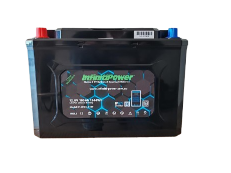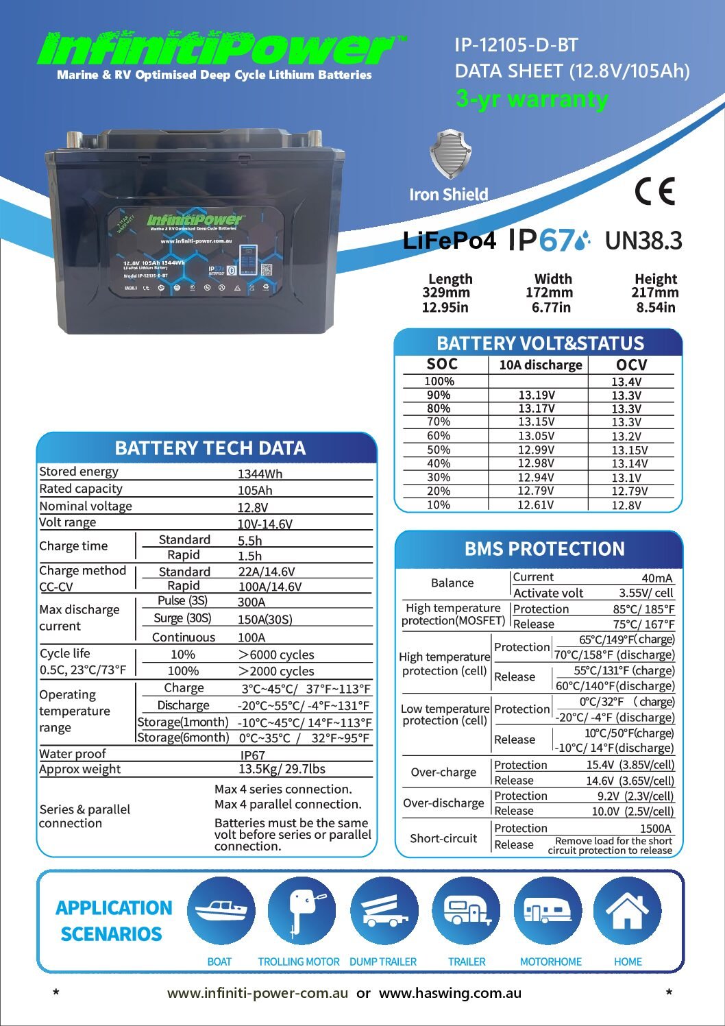 12V 105Ah 100A continuous, 300A surge LiFePo4 lithium battery with bluetooth APP. Light weight at just 11kgs and totally waterproof with built-in heat sink. Can put in parallel for increased amperage with unlimited expansion or series connection up to 48V (max of 4 batteries).
