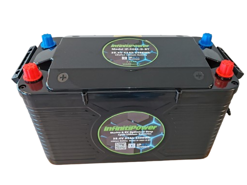 - InfinitiPower IP-12105-D-BT IP67 waterproof LiFePo4 lithium battery with Bluetooth monitoring, dual terminal posts